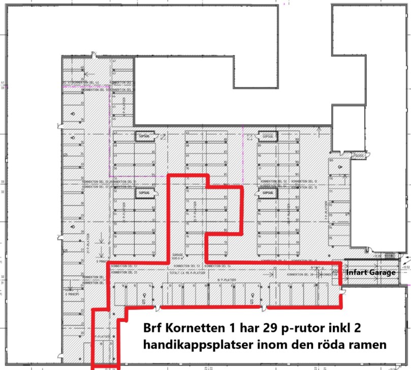 Corepark AB ansvarar för uthyrning av parkeringsplatser i ditt garage. Garaget har totalt 115 stycken parkeringsplatser. Av dessa tillhör 29 stycken Brf Kornetten 1 (varav 2 stycken är handikapplatser). Ifall du inte tidigare gjort intresseanmälan till Åke Sundvall AB (byggherren) är du välkommen kontakta Corepark.